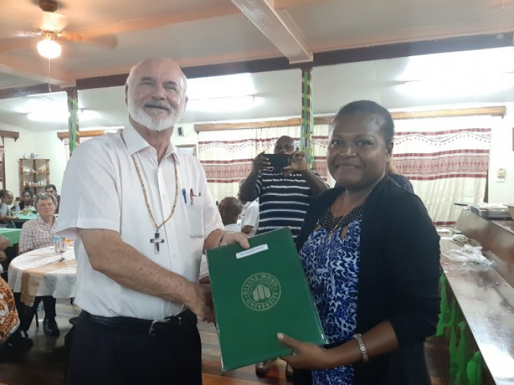 Written by Kevin PambaDWU Council Chairperson, Archbishop Dr Douglas Young SVD presenting the Excellence in Teaching Award